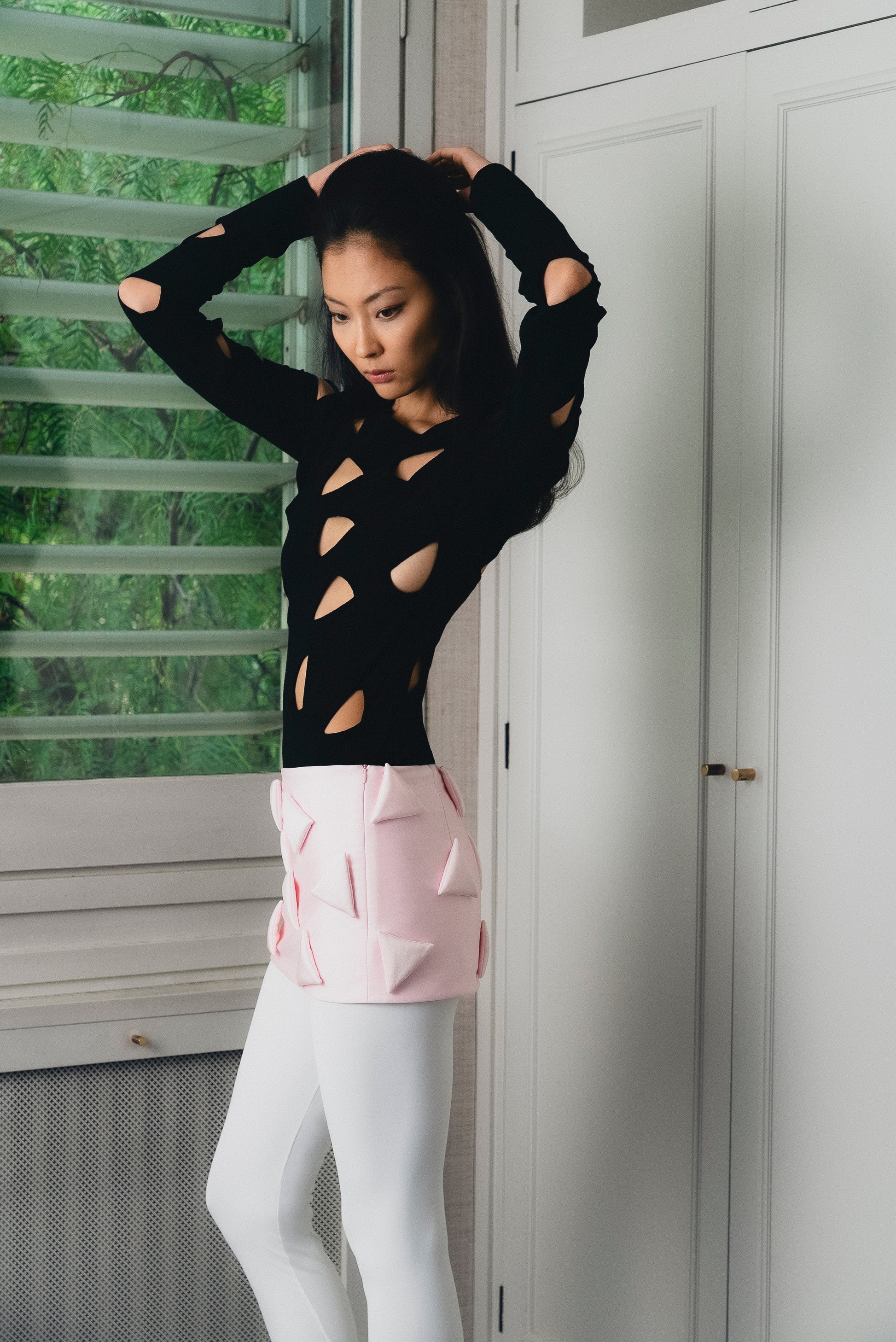 Long sleeve top with hand sewn triangular cutouts