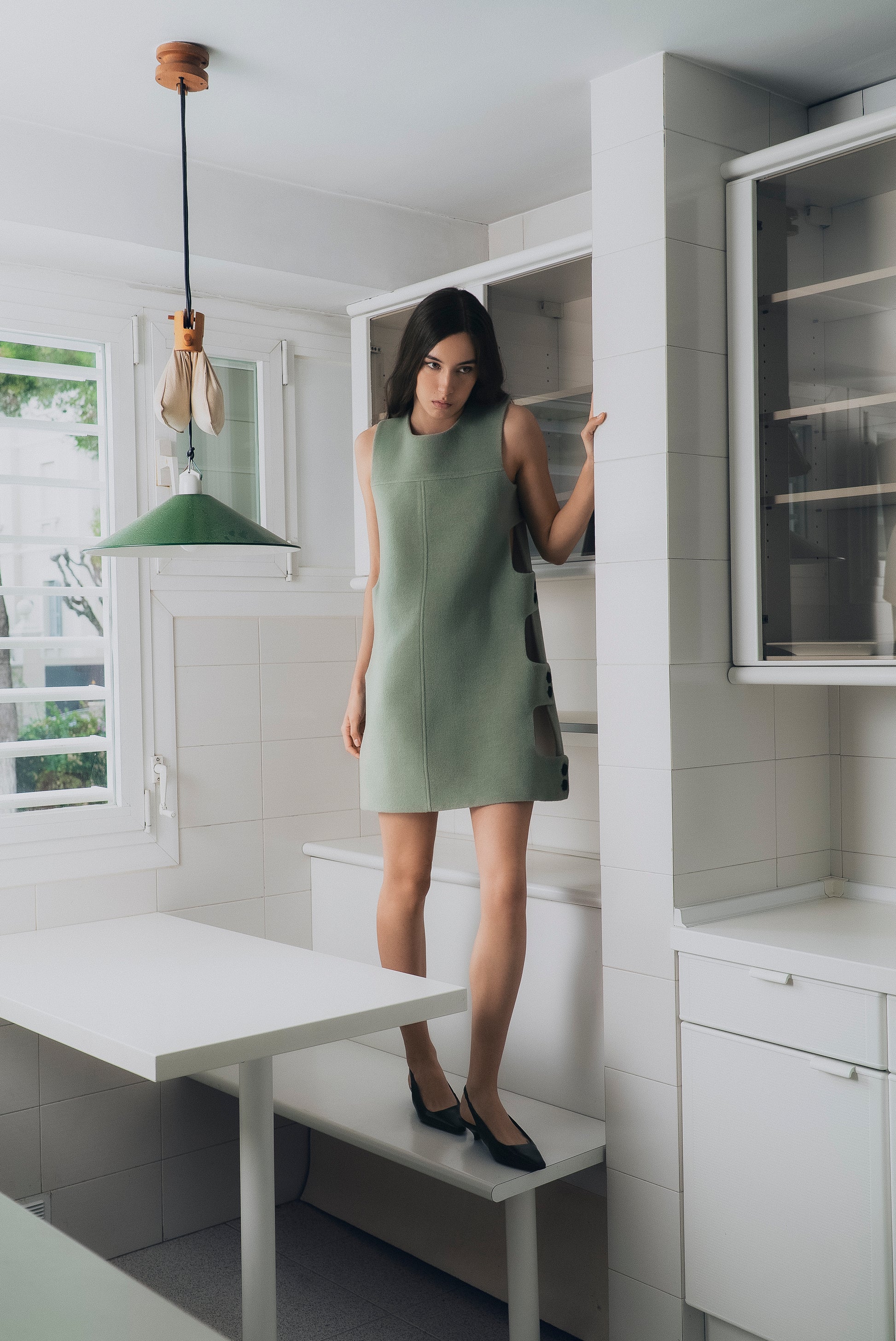 Apron dress with buttoned side panels